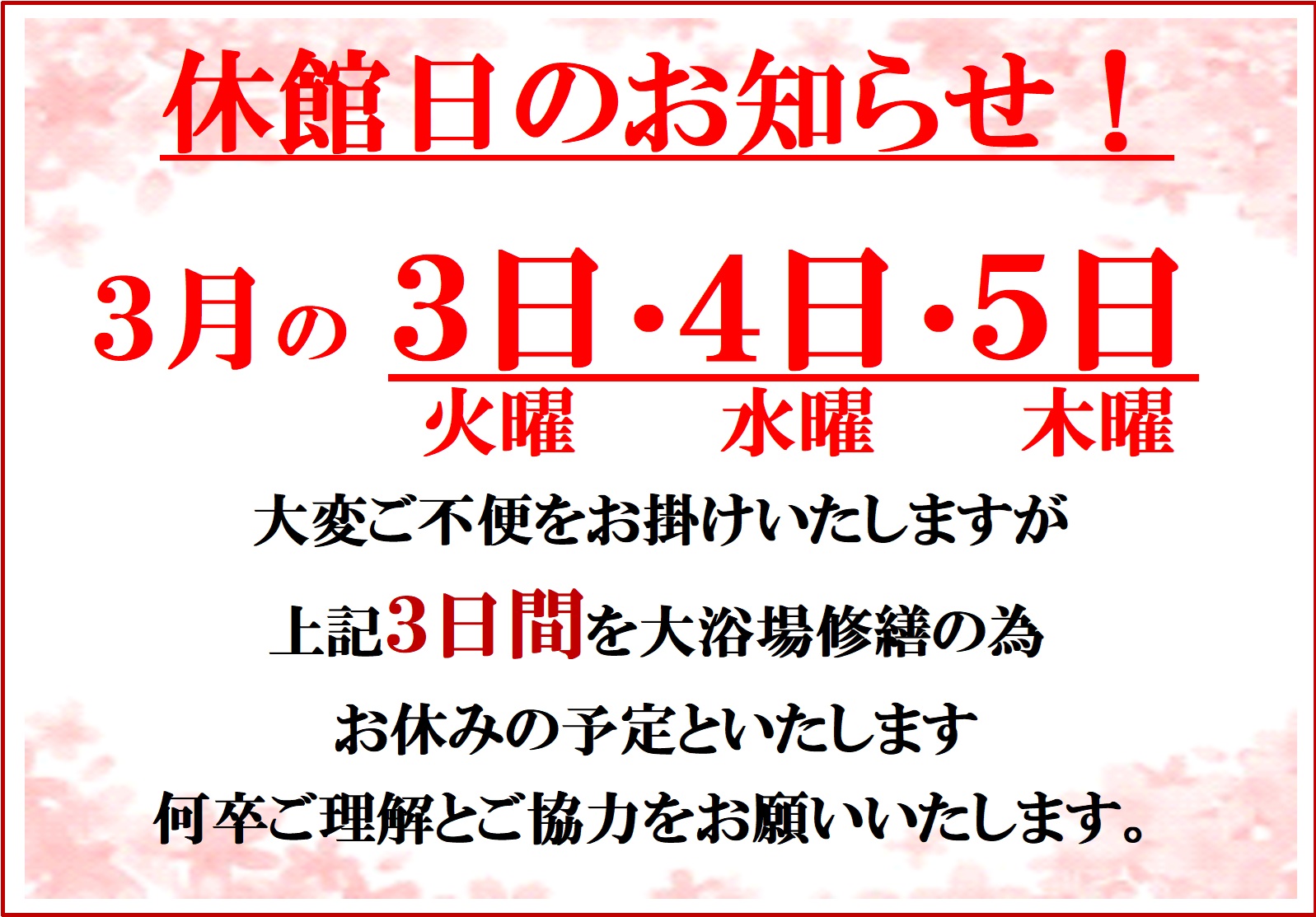 大浴場修繕のため全館休業とさせていただきます。